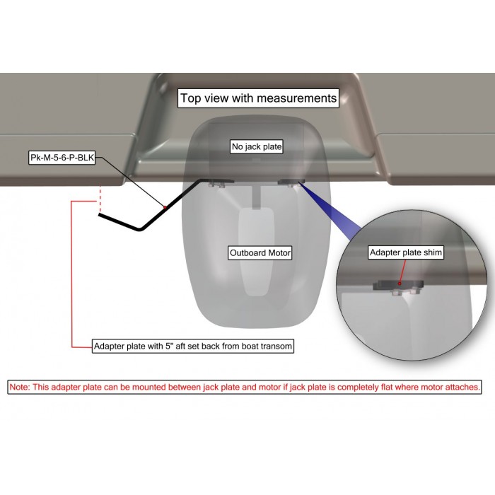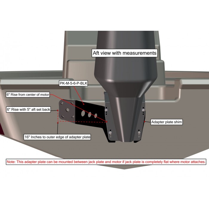 For non-transom-mounted installations. Power-Pole adapter plate mounting kit mounts between motor and jack-plate or between motor and transom. Provides 5" setback and 6" rise. Mounts port side of motor. Black.